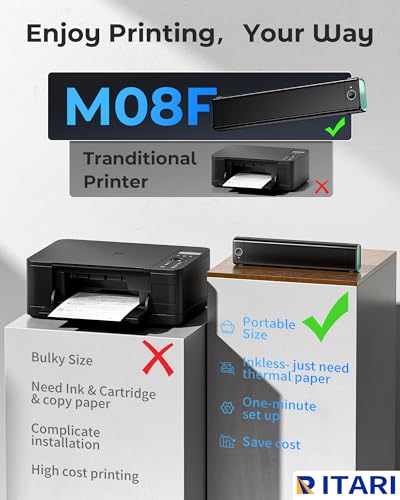 Why choose M08F portable printer?1. More Portable than Bulky Traditional PrintersM08F portable printer wireless for travel is only 1.57LB, fit for your bag at any time.2. More Cost-effective than Printers requiring Ink or RibbonsM08F compact printer adopts thermal printing technology, which needs thermal paper only, without ink or ribbon.3. Easier to Use than Computer-only PrintersThe M08F printer can be printed through your phone, Just install an APP and connect by Bluetooth, the files can be printed.